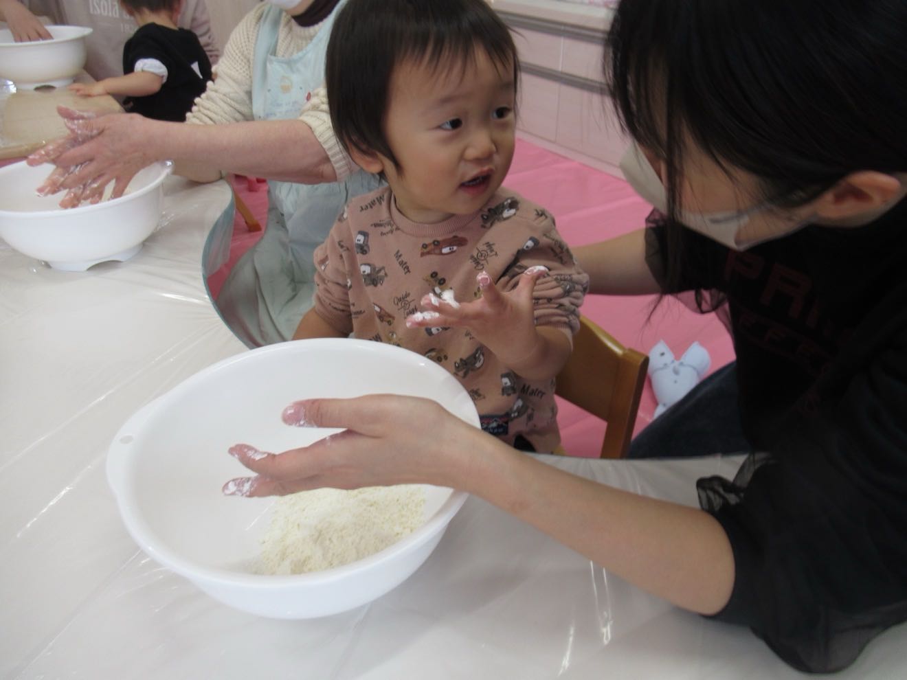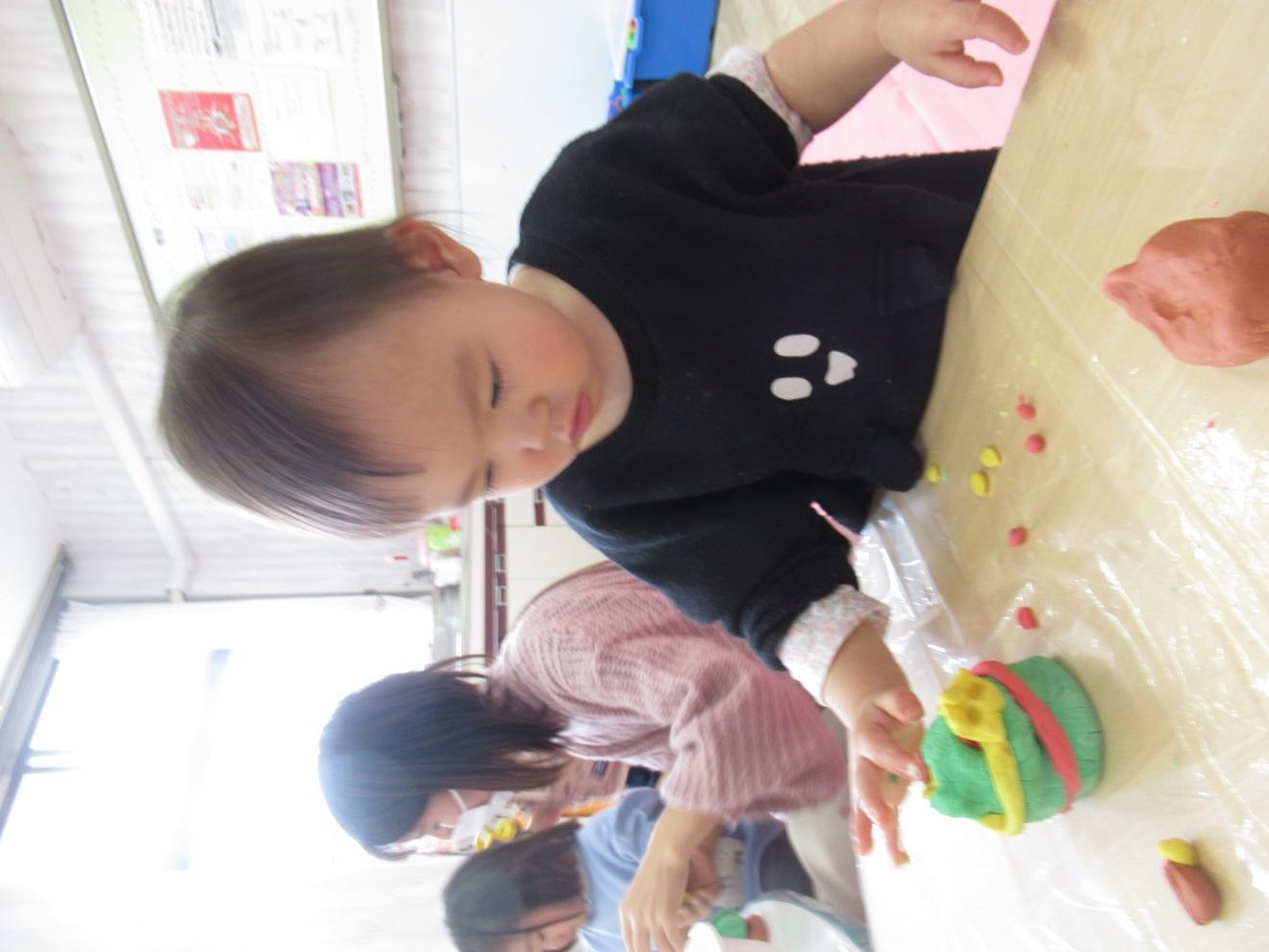 今回も大好評の小麦粉粘土で遊びました。粉を触って感触を楽しんだ子どもたちは、コネコネ、ペタペタをたくさんして素敵なクリスマスツリーができました。メリークリスマス!