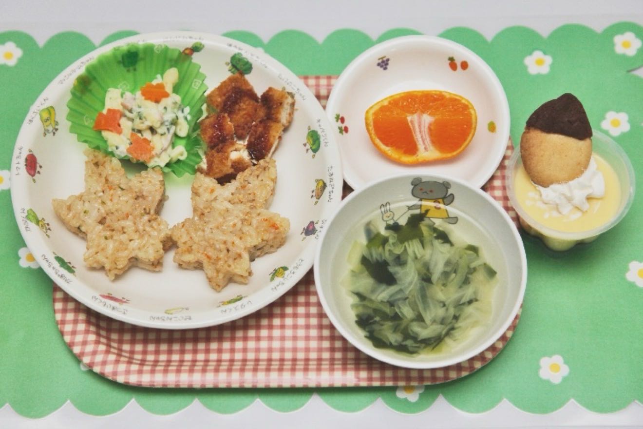 秋らしくご飯をもみじの形にしました。サラダにも人参のもみじを飾っています。