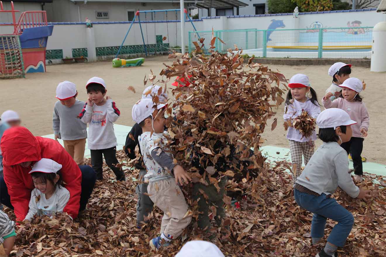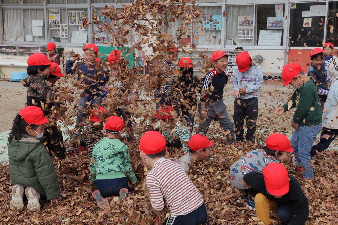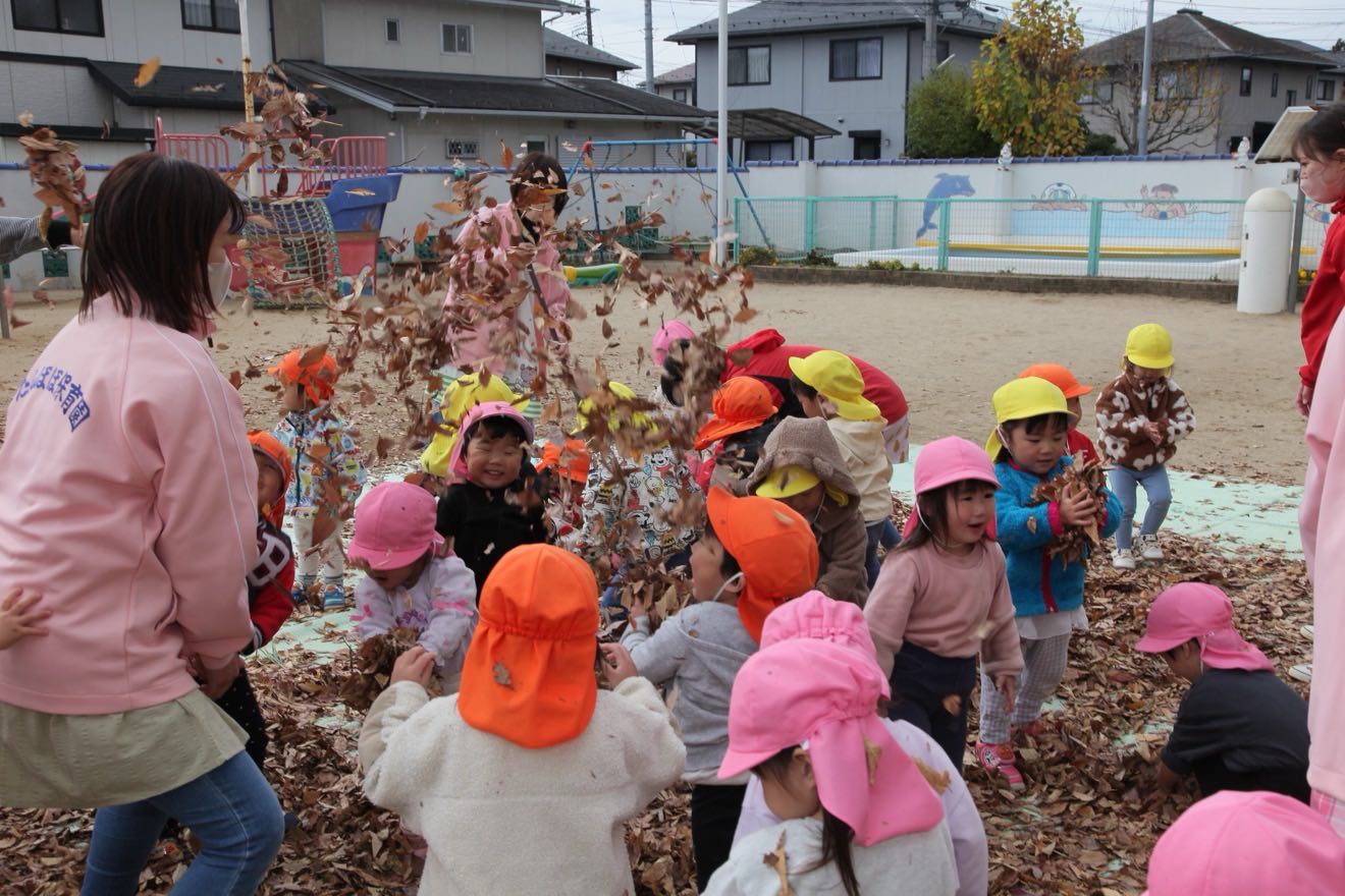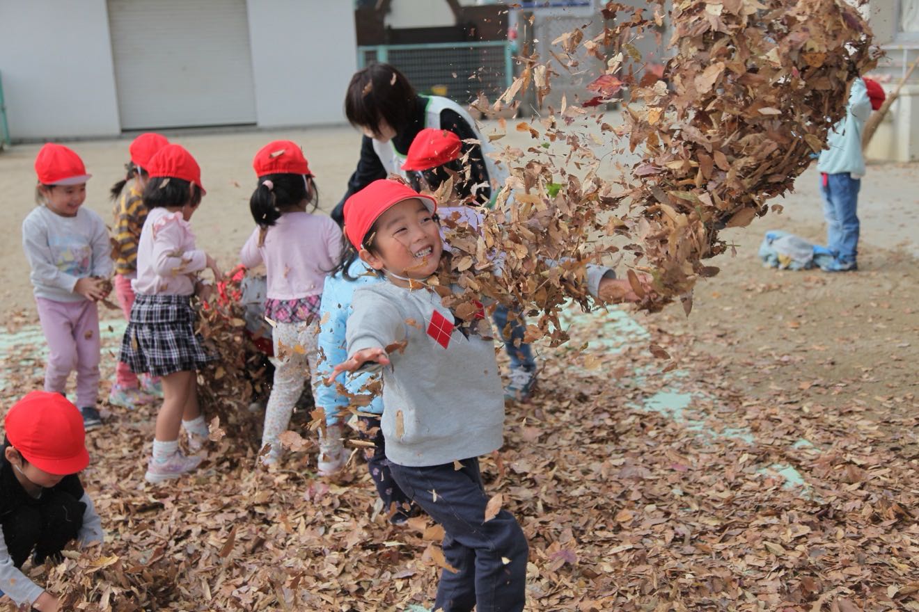 たくさん集まった落ち葉を「5.4.3.2.1. ヒュー!!」と空高く葉っぱを放ち、落ち葉のシャワー。 歓声を上げながら、楽しく葉っぱの感触を楽しみました。体にかけると暖かくなることを発見しました。