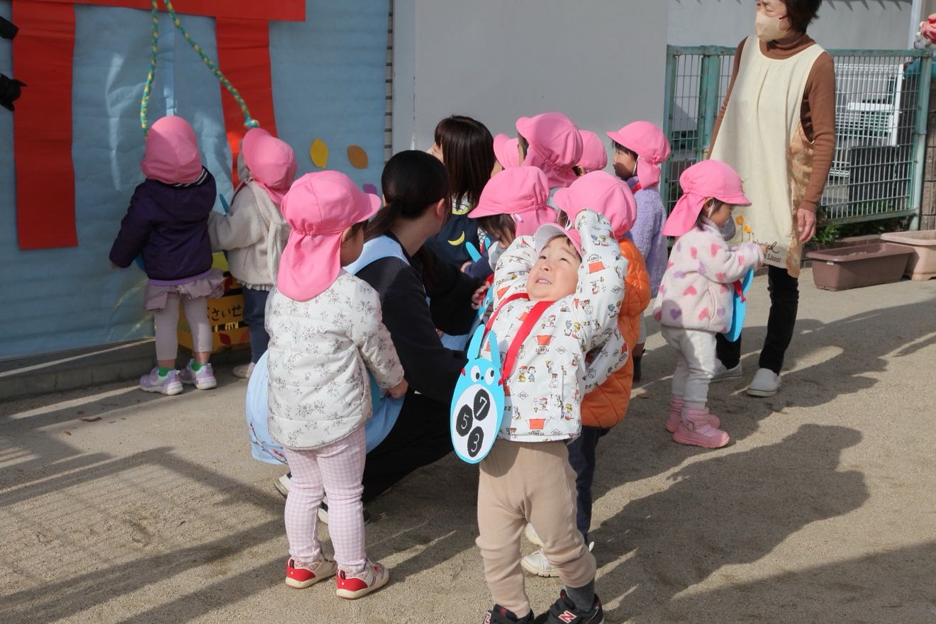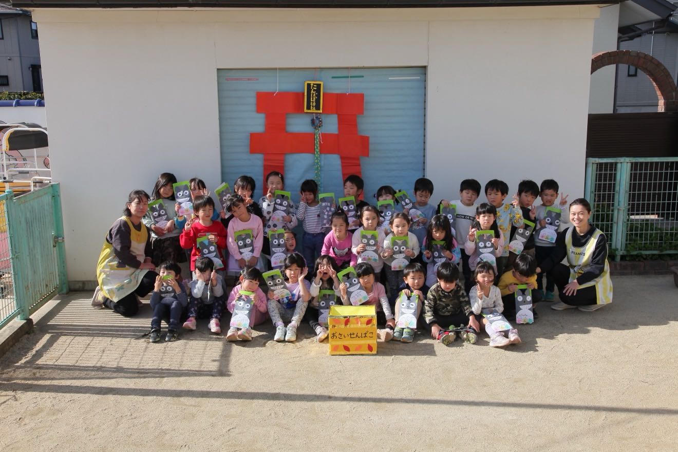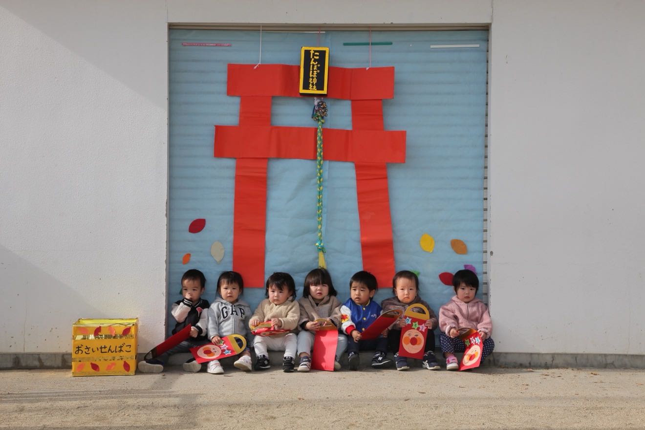 園庭にたんぽぽ神社を作って、みんなでお参りしました。手作りの千歳あめ袋を持ち、子ども達は嬉しそうで、可愛らしい笑顔が沢山みられました。これからも、元気に大きくなりますように・・・。