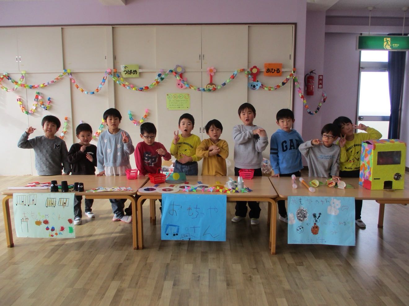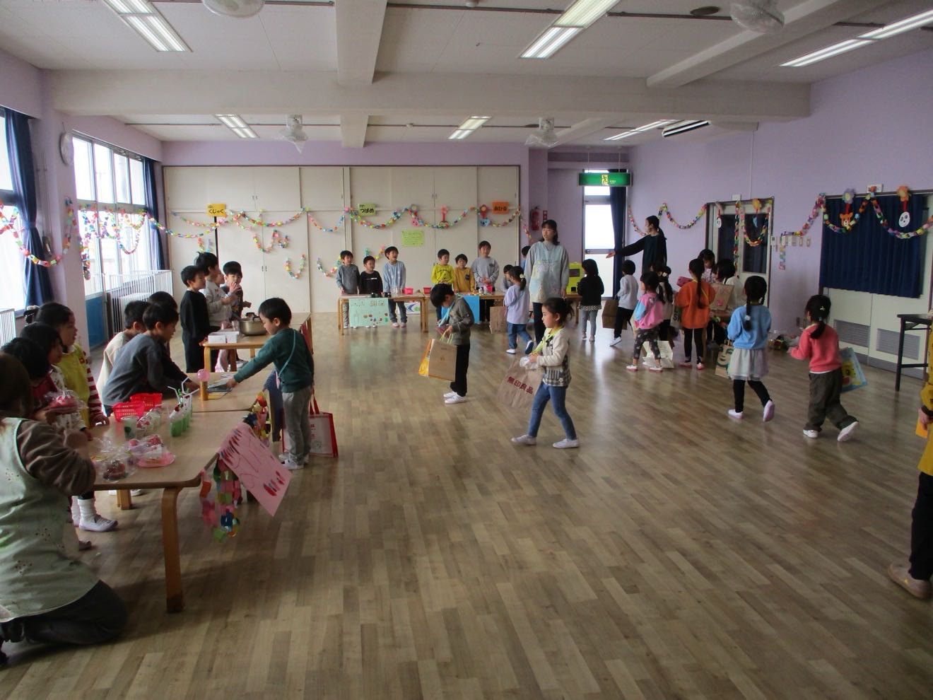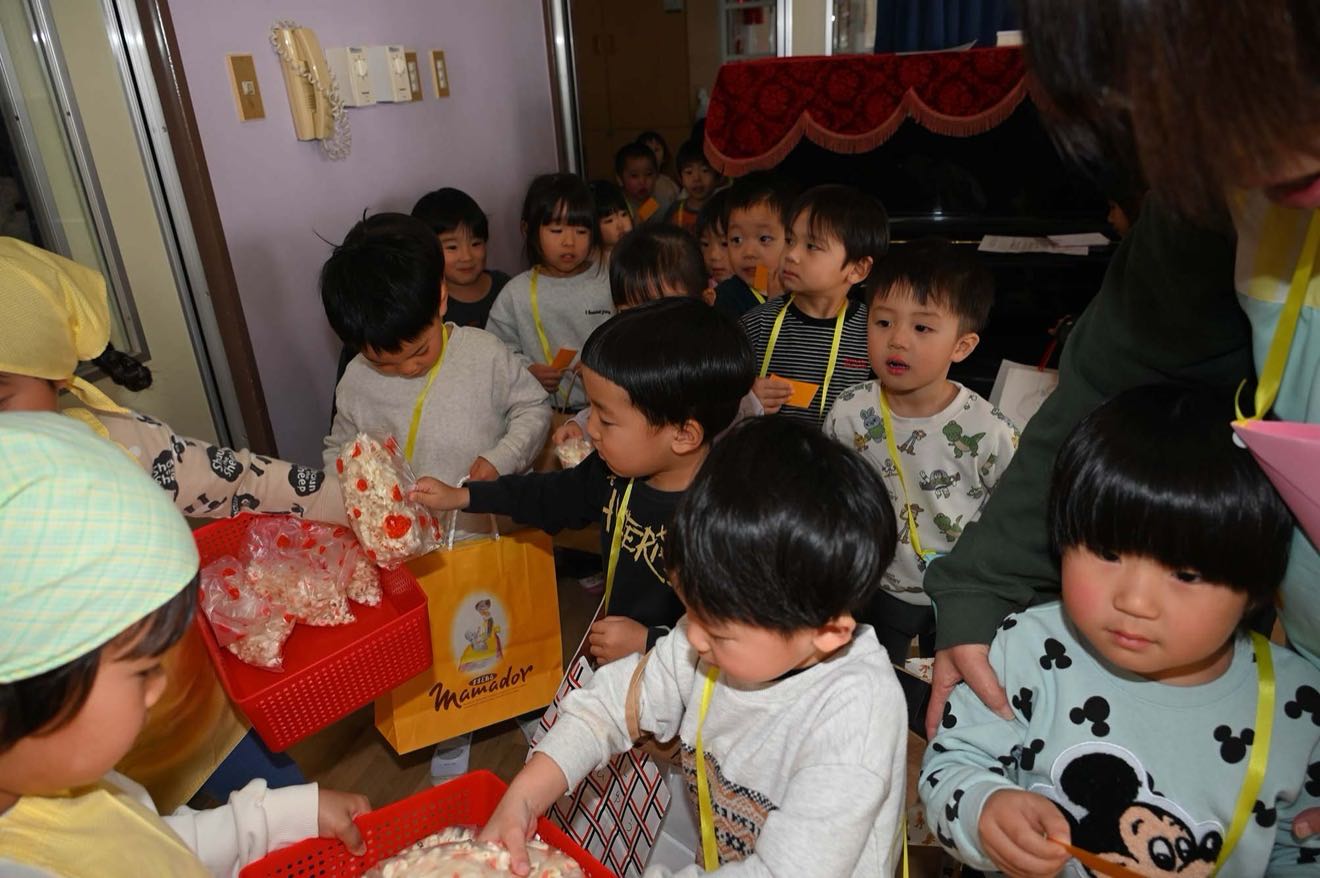 「つくったおもちゃをかってもらえるかな?」 「なにをかおうかな~?」と楽しみにしていたお買い物ごっこ♫ つばめさんがお店屋さんになって小さい組のお友だちがお買い物に行きました。 「いらっしゃいませ」「これください」とお友だちとのやり取りを楽しみました。 そしてお昼はホールがたんぽぽマックに変身!!ハンバーグを頬張り「おいしい!!」楽しかったね。 「おいし~い♡」とたくさん食べる子どもたちでした。