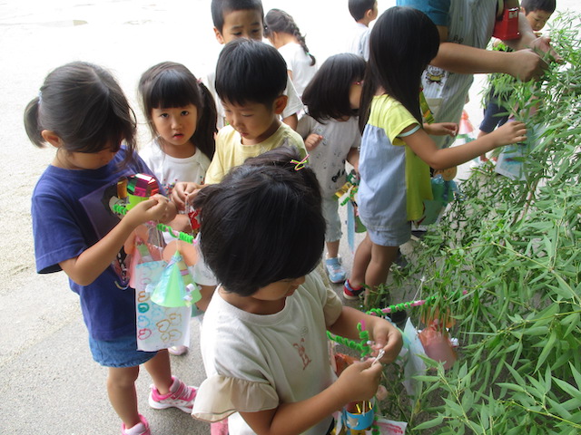 つばめ組のお友だちが、畑から切ってきた竹を「わっしょい わっしょい」と運んできてくれました。 〝願い事、叶うといいなあ″