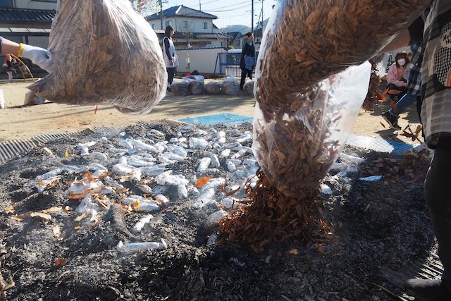 お散歩で拾ってきた葉っぱや石川県から届いた葉っぱを使って、楽しみにしていた焼き芋会! つばめ組とくじゃく組のみんながさつま芋をホイルで包んでくれました。焼きたてのさつまいもを 「アチッ」「うまい!!」とニコニコと頬張っていました。