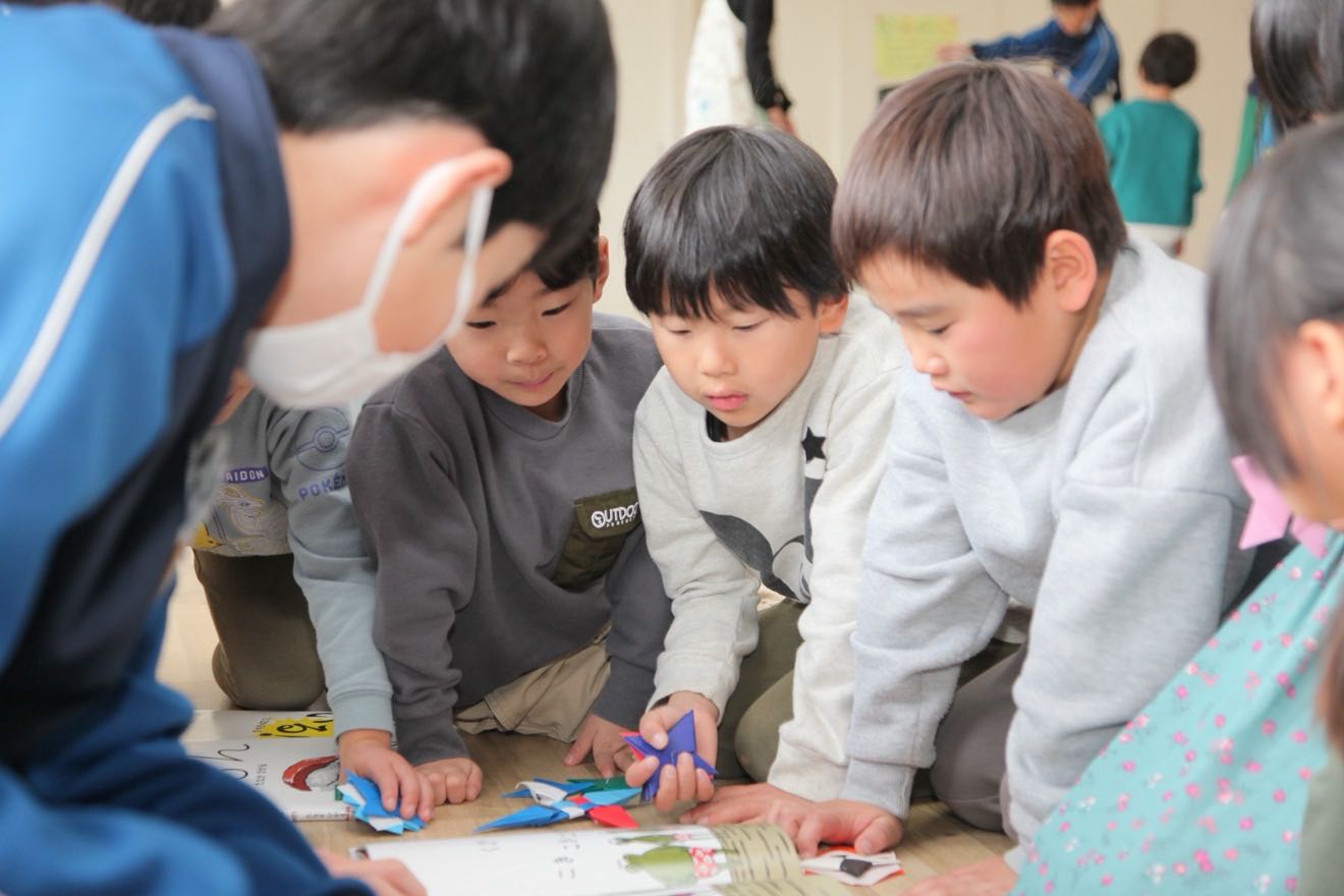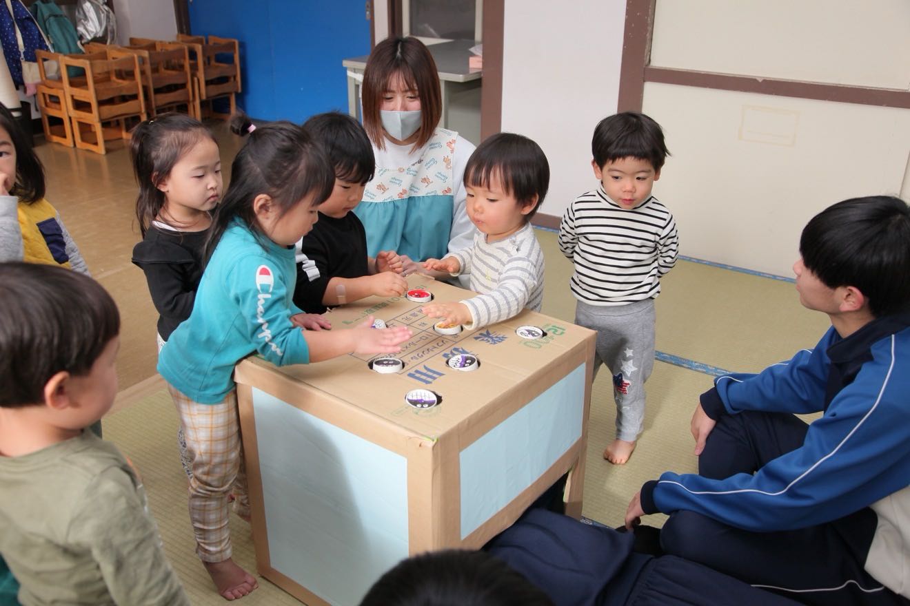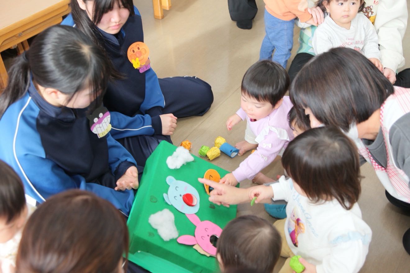 清水中学校の2年生が家庭科の授業の一環として、手作りおもちゃを持参して遊びに来てくれました。珍しいおもちゃに興味津々の子どもたちでした。中学生のお兄さん、お姉さんと楽しく遊べて良かったね!