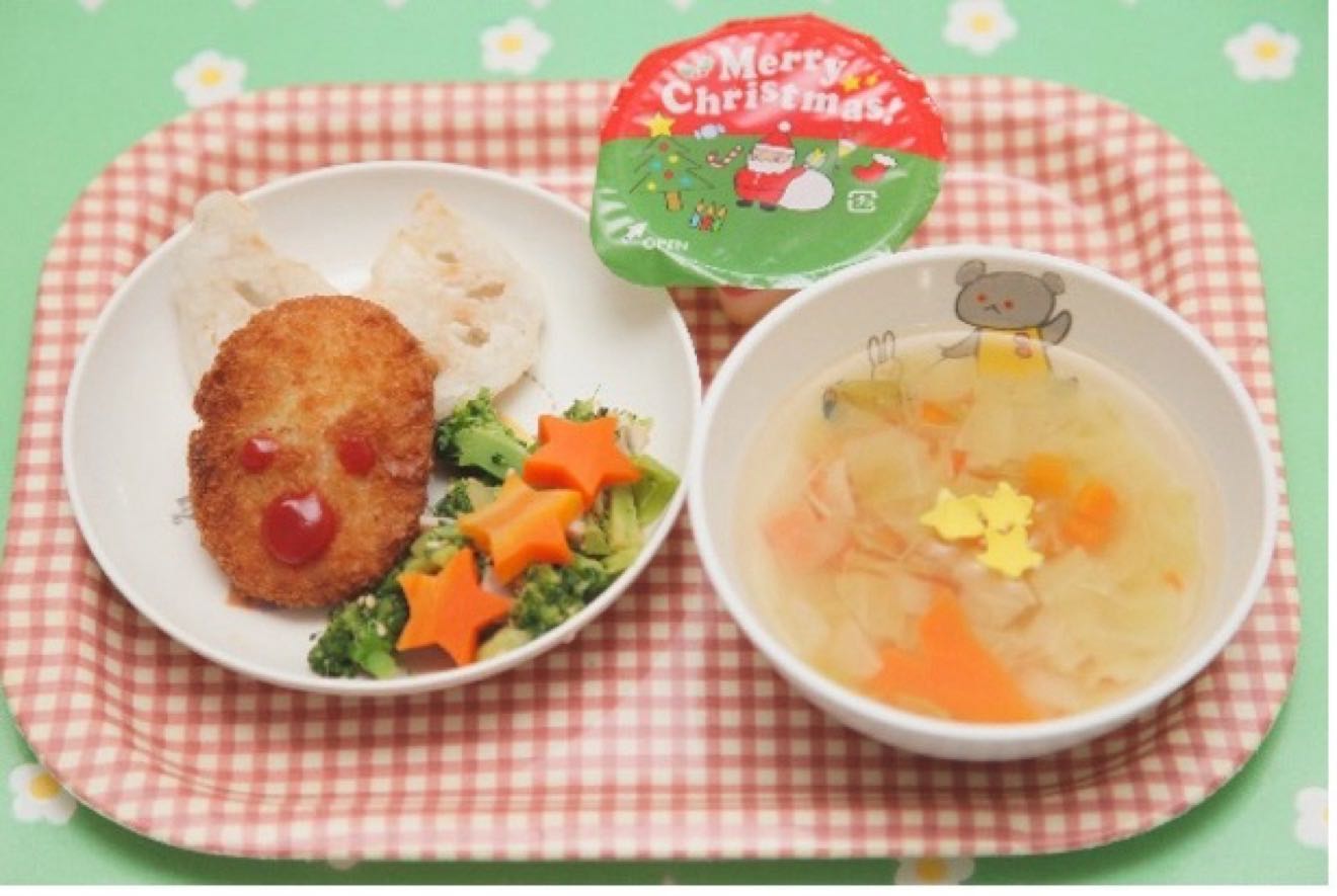 雪だるまのカレーに、クリスマスの型で抜いた人参をトッピングしました。トナカイ、ジンジャーブレッドマン、ツリー、ひいらぎ、みんなは何の形の人参だったかな?